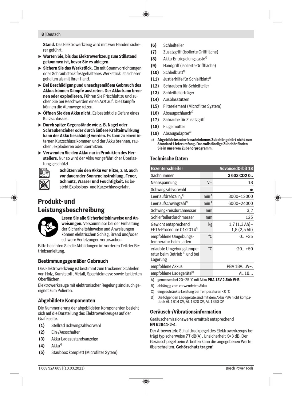 A) gemessen bei 20−25 °C mit Akku PBA 18V 2.5Ah W-B